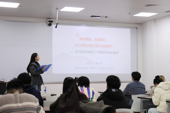 12月18日下午,中国石油大学(华东)星火宣讲团走进古镇口校区,马克思主义学院博士研究生郝思淇在新能源学院开展专题宣讲,深入解读党的二十届四中全会精神与“十五五”规划《建议》核心要义,引导青年学生将个人发展融入国家发展大局。